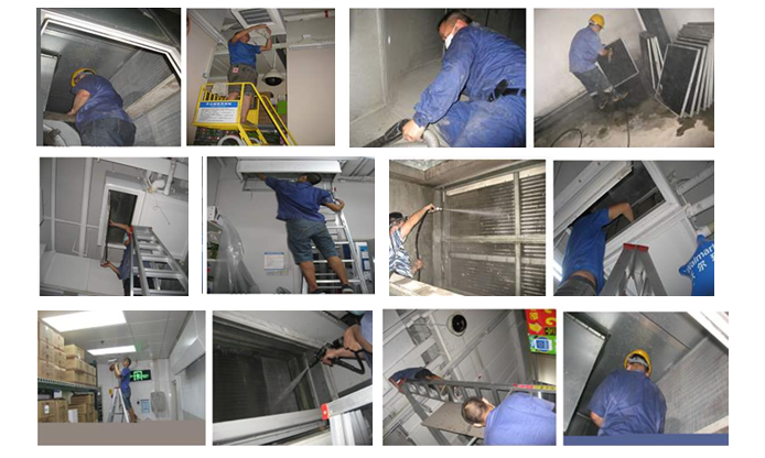 長沙某大型超市中央空調(diào)公共區(qū)域采用“水冷機組+空氣處理機”的全空氣處理系統(tǒng),共有空氣處理機19臺,局部區(qū)域如員工辦公室、檔案室等采用風(fēng)機盤管,共有風(fēng)機盤管26臺。中央空調(diào)投入使用已3年多,甲方委托我司對風(fēng)系統(tǒng)進行清洗保養(yǎng)服務(wù),此次共清洗空氣處理機19臺、風(fēng)機盤管26臺,清洗風(fēng)管約7500平米(展開面積),清洗空調(diào)風(fēng)口300多個。以下為清洗實施方案: