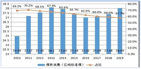 國(guó)家能源發(fā)展十三五規(guī)劃:到2020年,能源消耗總量控制在50億噸標(biāo)準(zhǔn)煤以內(nèi)。2019年全國(guó)煤炭消費(fèi)量約28.04億噸標(biāo)準(zhǔn)煤,煤炭消費(fèi)量占能源消費(fèi)總量的57.7%。