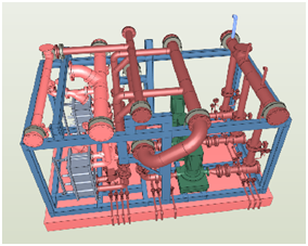 2) 按照廠家提供的機(jī)組、水泵等設(shè)備和閥門、過(guò)濾器等附件的尺寸大樣圖, 進(jìn)行1:1精確建族,使整個(gè)機(jī)房?jī)?nèi)的管道、設(shè)備、構(gòu)件等全部遵照實(shí)際尺寸比例,然后綜合考慮各方因素對(duì)機(jī)房模型調(diào)整優(yōu)化,待機(jī)房方案例如排水溝位置、設(shè)備布置方案、管道排布走向確定后,對(duì)管道進(jìn)行合理分段劃分,并進(jìn)行BIM建模;
