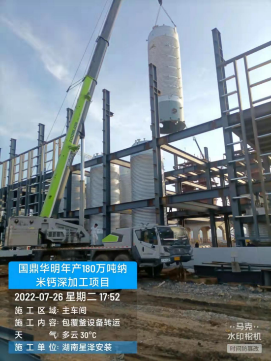 年產 180 萬噸納米鈣深加工項目安裝工程,安裝地點在湖北省黃岡市武穴市武穴大道。納米鈣深加工項目裝置界區(qū)范圍內的安裝工程,主要包括:消化車間、陳化車間、主車間、窯氣洗滌、動力車間、循環(huán)水站等設備安裝、設備輔助平臺鋼構施工等。