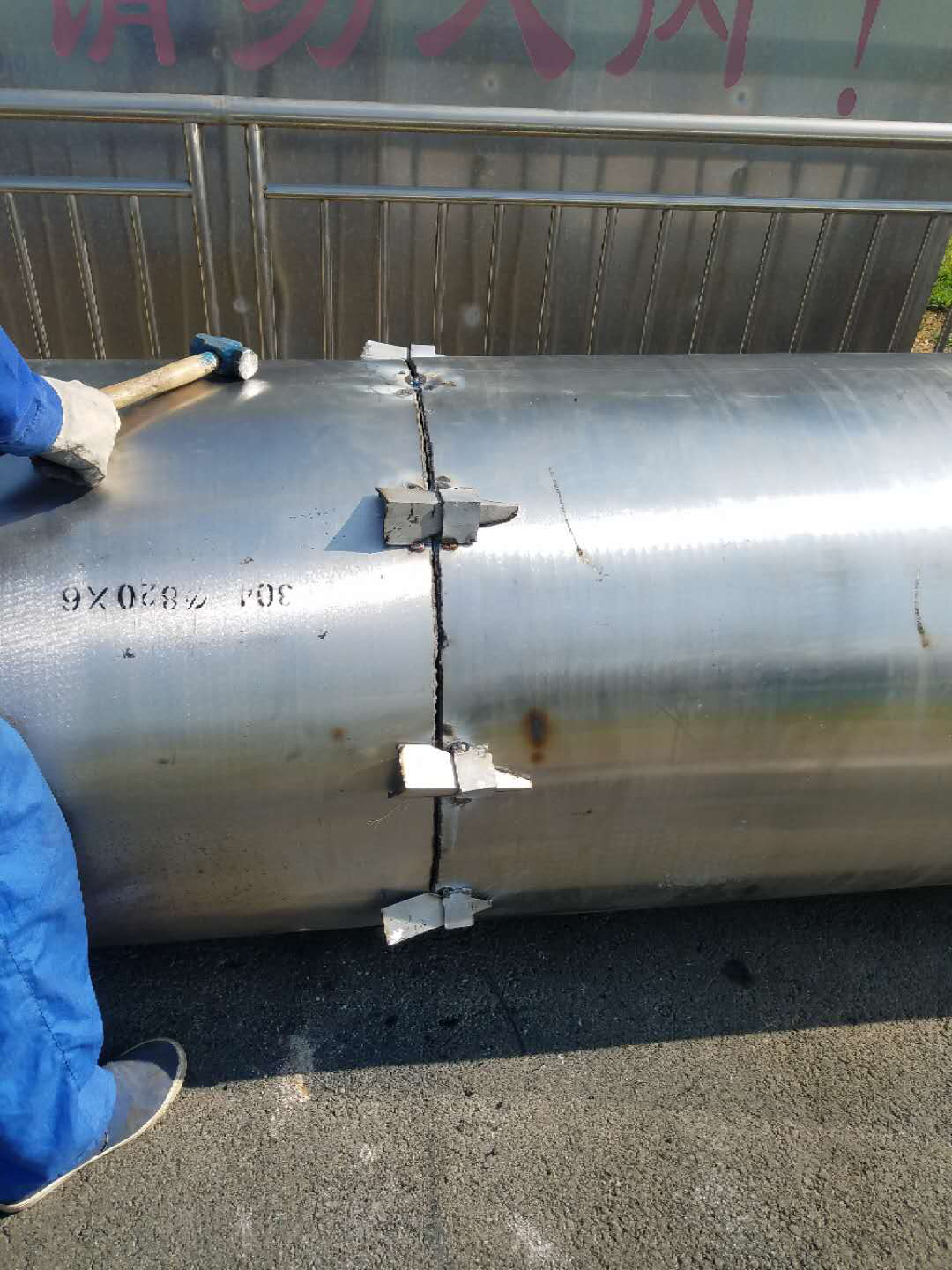 通過公司技術(shù)人員對現(xiàn)場原有煙囪的尺寸進行測量,由于采用6mm厚304不銹鋼板加工制作煙囪,板材厚度較厚,加工精度要求較高,所以必須仔細對現(xiàn)場尺寸復(fù)核好并繪制加工圖紙。繪圖完加工廠對圈圓工藝進行圓周同心度定量控制,對煙囪分段加工成型。達到自檢合格標準,其ф800和ф600圓度誤差為1.5mm,符合國家標準3mm范圍內(nèi),滿足質(zhì)量要求。外觀檢測直縫焊縫拋光等處理合格,未見明顯的焊縫,符合《現(xiàn)場設(shè)備、工業(yè)管道焊接工程施工及驗收規(guī)范》GB50236—2011。