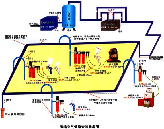 5、壓縮空氣管道安裝完畢后,應(yīng)進行強度和嚴密性試驗,試驗介質(zhì)一般為水。當(dāng)工作壓力P<0.5MPa時,試驗壓力Ps=1.5P,但Ps ≮0.2MPa; 當(dāng)工作壓力P≥0.5MPa時,試驗壓力Ps=1.25P,但Ps≮ P+0.3MPa。管路在試驗壓力下保持20分鐘作外觀檢查,然后降至工作壓力進行嚴密性實驗,無滲漏即為合格。