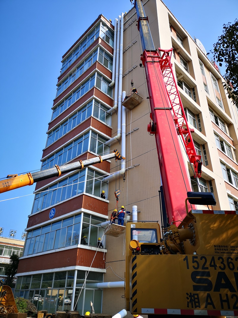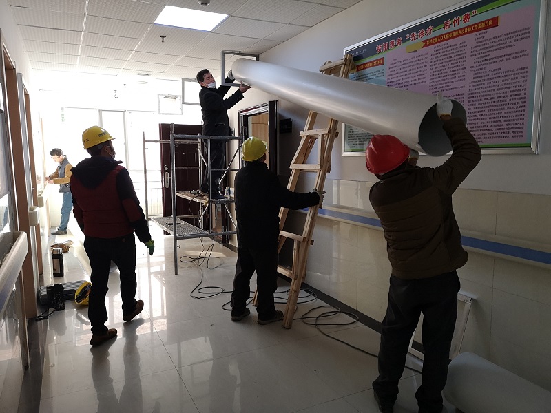 在現(xiàn)場指揮部的緊密組織下,我們迅速調(diào)集路口鎮(zhèn)周邊班組50名工人,財務采購排風電話、微信到處尋找風管材料和配件于下午五點到達工地,工人師傅連夜加班,把進度往前趕,為爭取第二天基本完成整棟八層的公共區(qū)域新風管道安裝卯足了干勁。