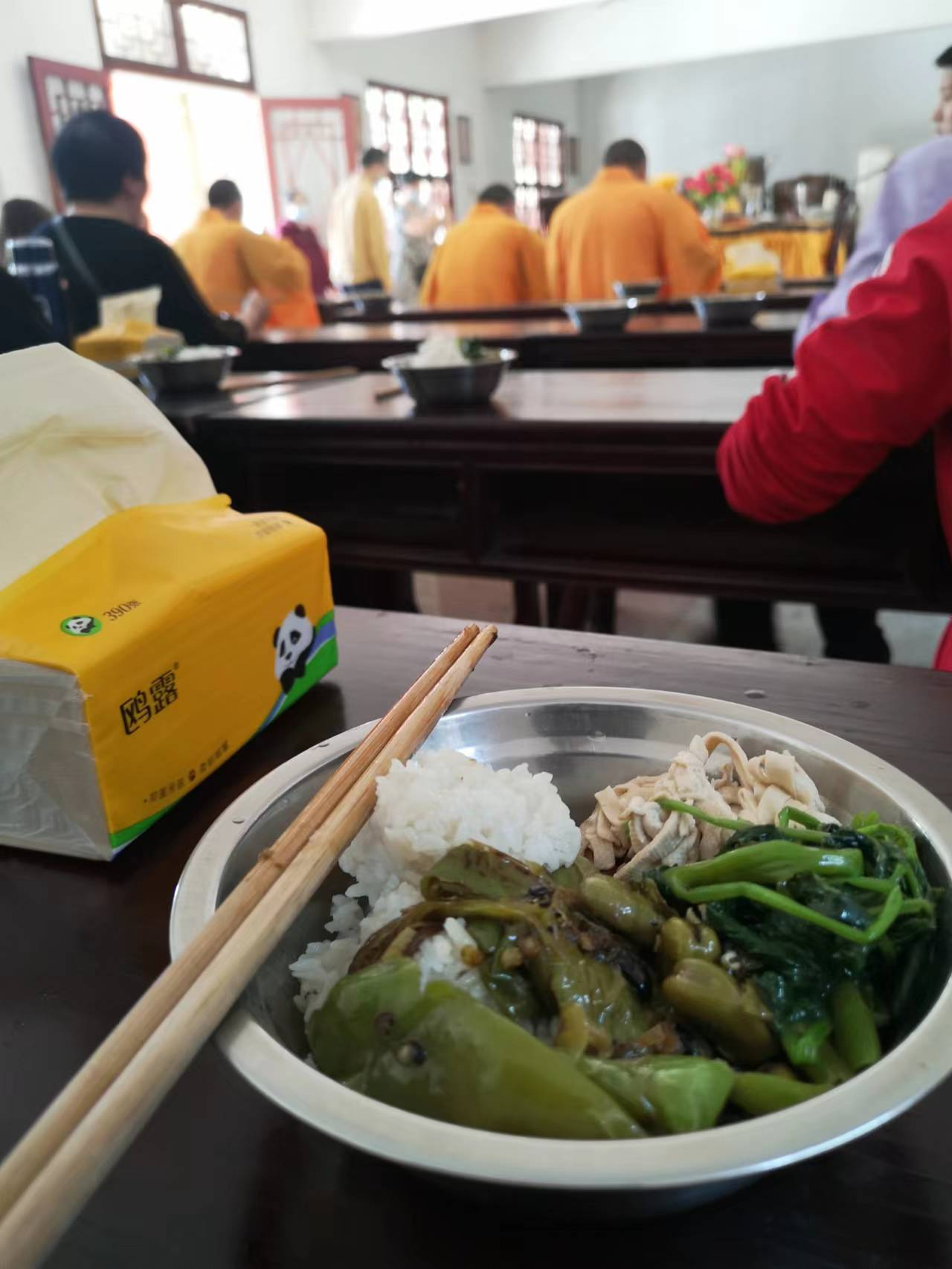 已到正午時分,僧人和修持者早課正好完畢。人總是要常懷善念和慈悲之心,功德箱里去盡份心意,有侍者見到,忙作揖謝過,并沒有見我行跪拜菩薩,就覺得有點怪,但她也不知道我信仰的??吹街形缟堥_始,我入得堂內(nèi)想看過究竟,僧人們又正在唱誦經(jīng)文,猜想可能是什么神農(nóng)五谷經(jīng)之類,應該是感恩大地所賜五谷,讓眾生得以生存。大住持還用筷子和湯匙,挑上幾粒米飯,在眾僧們的唱誦下送出門外,轉(zhuǎn)回來時不見飯粒,想必是他們感恩回饋,或許,是照顧其他眾生,如貓狗老鼠螻蟻之類生靈,給予它們一些生存的食物,看來,此舉就可以說證得“眾生平等,普渡眾生”佛法,看來菩薩邊鬼也喜歡的。為了體驗廟堂齋飯,我便使出孫行者頭銜向負責飯?zhí)玫墓芾砥蛴懸活D齋飯,她看我一個人并就答應了,安排好飯桌,像眾僧們一樣等待施飯,這里吃飯的主要是僧人,另外就是習佛修行的信眾和居士,大家都安靜的坐著,好像小學生等老師來上課。在施飯者挨個進行時,看到僧人們個個雙手合十,點頭謝過,此情此景讓人好生感動。每施到我,一股油然而生的感恩之情溢于言表,不禁也雙手合十,點頭感恩。雖是齋飯,但色香味美不失家常,只是不葷罷了,菜品和味道讓我來了一次光盤行動,對鋤禾之辛苦體會更深了,因不勞而獲的幸運讓我動容。